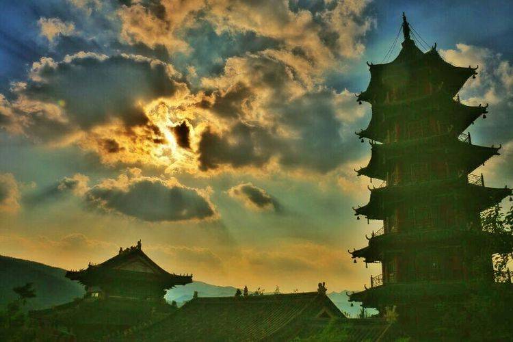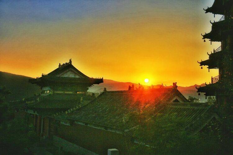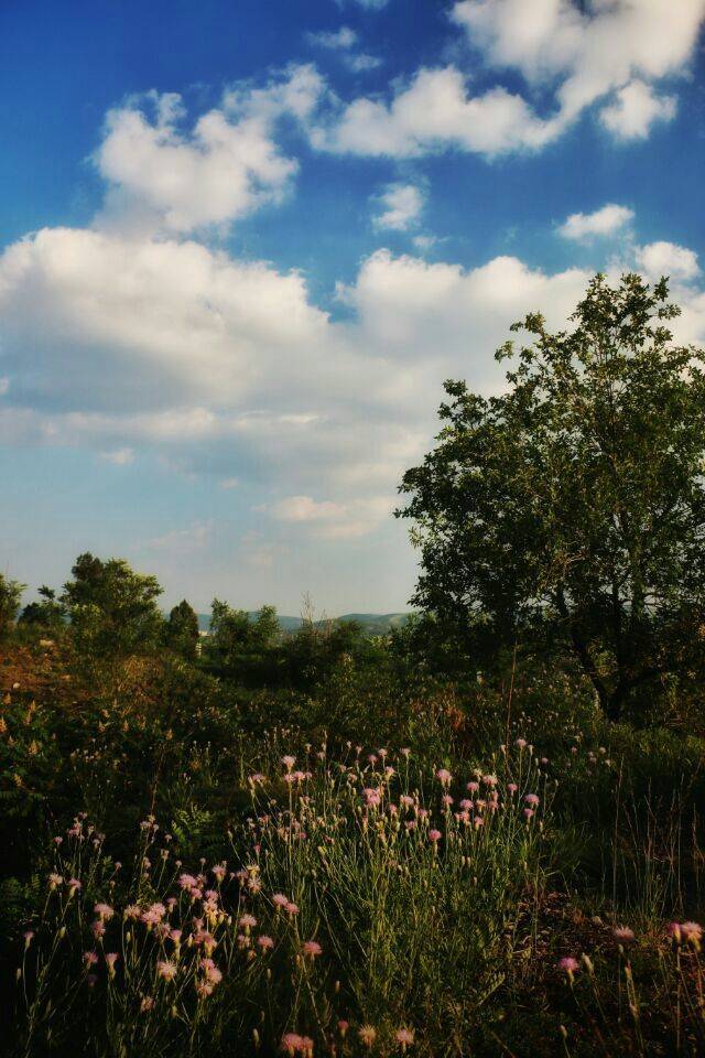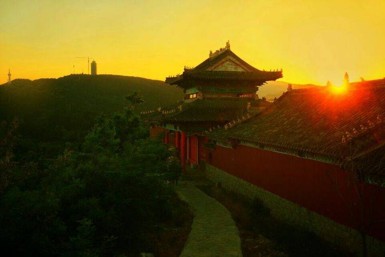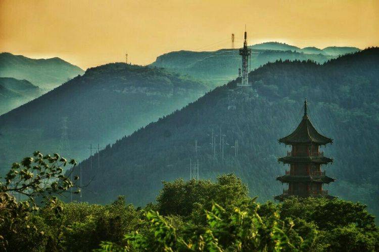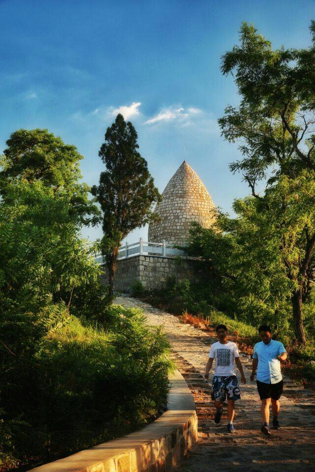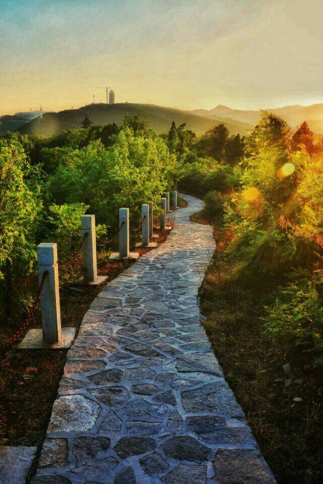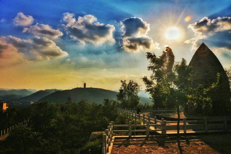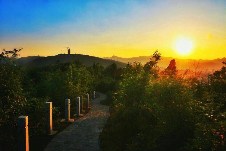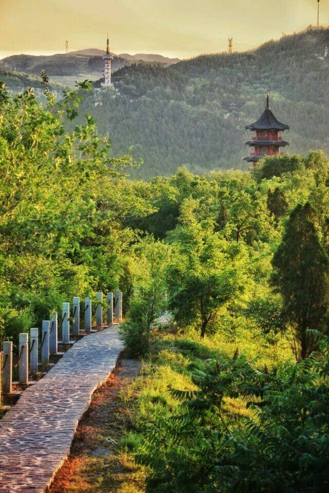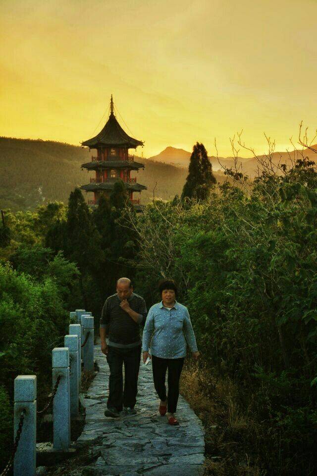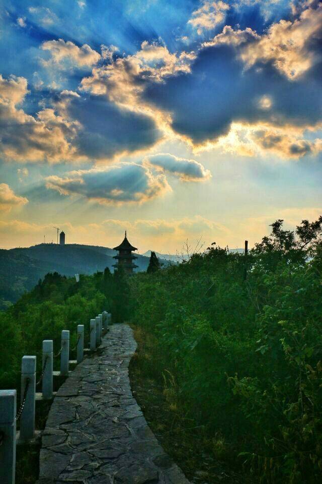 博山城南峨嵋山,夏日的傍晚,夕阳普照,绿树葱郁,鲜花丛丛,曲径通幽,有文昌阁文笔峰矗立山顶,与原山遥响呼应,成为一道靓丽的风景。