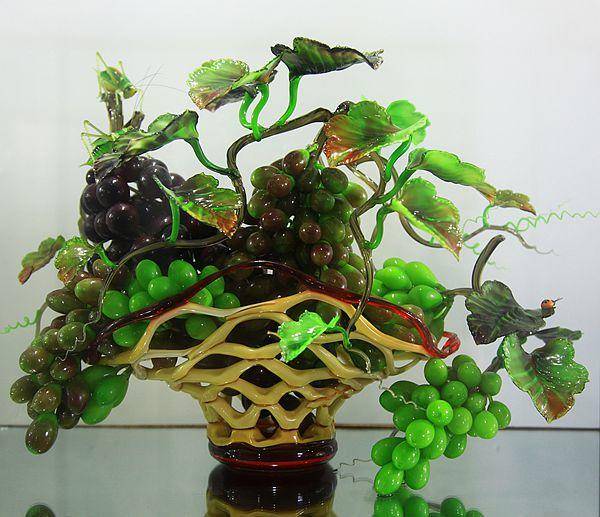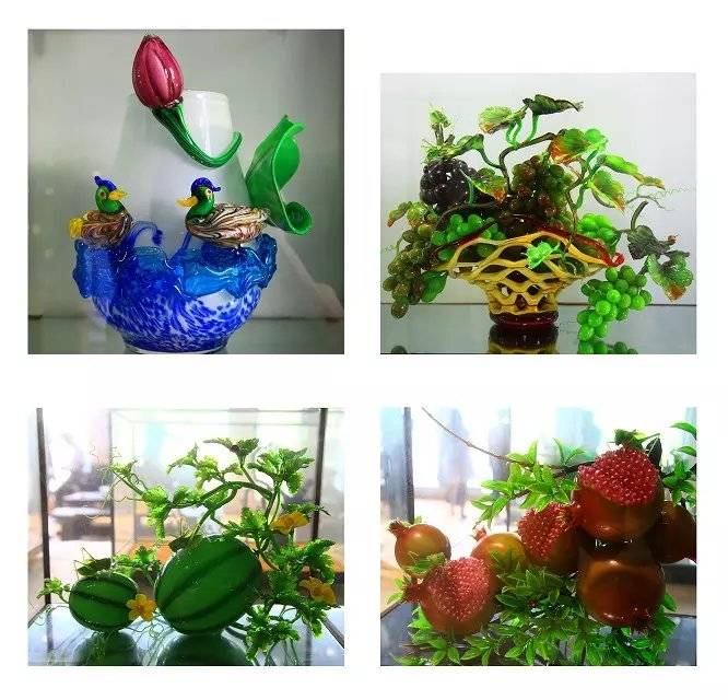 三是灯工车间。灯工是热成型的一种,却不在热成型车间,需要独处一室,静心制作。灯工指的是将氧气和液化气送入喷灯后,用喷灯喷射火焰给琉璃料条加热,琉璃大师借助钳子、刀片等小工具对琉璃条进行塑型,制作瓶子、动物、挂件或者花、鸟、松、石、盆景等。最有代表性的当属那些“牡丹”“石榴”“葡萄”“桃子”“白菜”“萝卜”“蝈蝈”等工艺品了。一件灯工作品的完成少则需要十天、几十天的时间,多则需要几个月甚至更多时间。工作期间,喷灯喷射的火焰高达800度,琉璃大师稍有不慎,不是自己被烫伤,就是作品出瑕疵,难度实为不小。