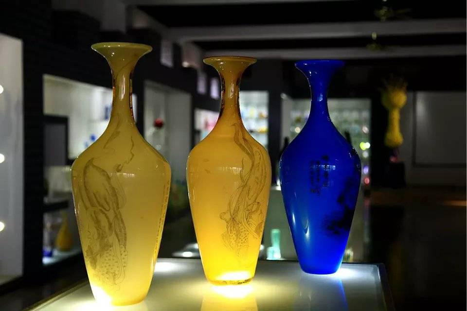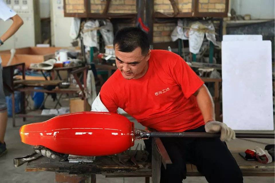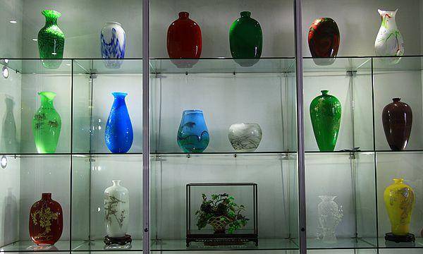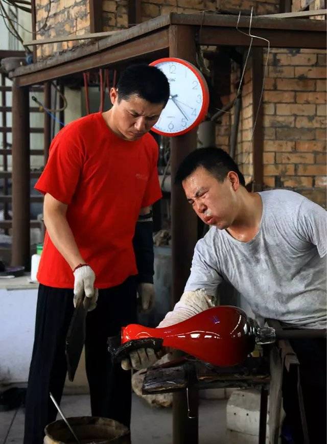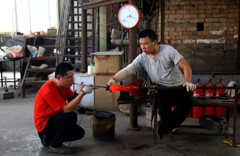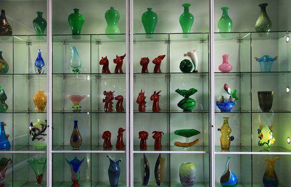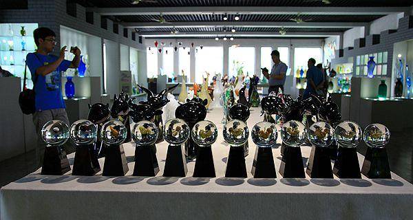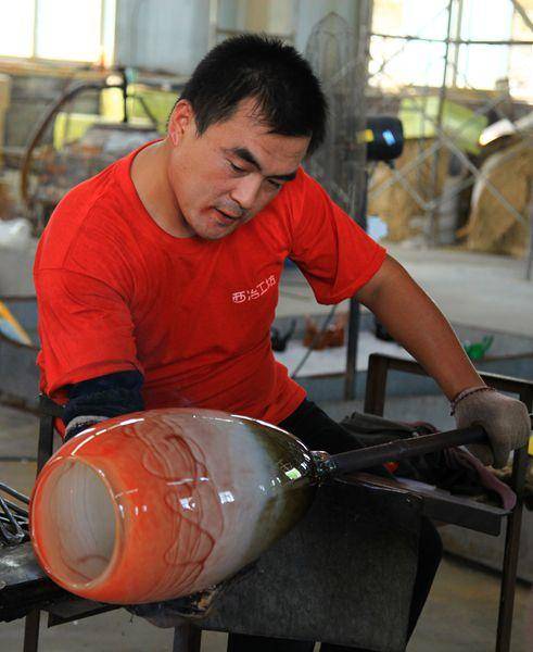 一是热成型车间。在这里,你会看到琉璃大师挥汗如雨,不停地穿梭于炉口与工作台之间。根据订单需要,一团火红的琉璃在他们手里如同变魔术一般成了老鹰、兔子、神龟、仙鹤,或者大大小小、玲珑剔透的花瓶、挂件和各种器皿,真是花样应有尽有,色彩浓淡相宜,神态惟妙惟肖。琉璃大师们胸有丘壑,用户需要什么他们就制作什么,或者说他们想创造什么就创造什么。根据工艺品的大小难易,一件工艺品的成型大约二十分钟至一个小时就可完成,繁琐的大件一天也能做三四件或七八件。作品成型后,立刻送入400度的温炉慢慢降温,四天后出炉方知这件作品是精品还是存有瑕疵。要知道,出精品的概率只有10-20%,瑕疵却是防不胜防。