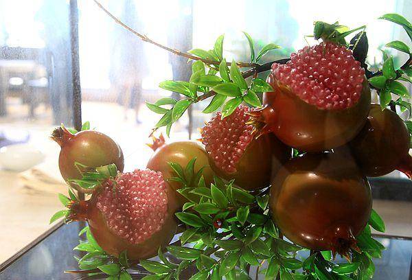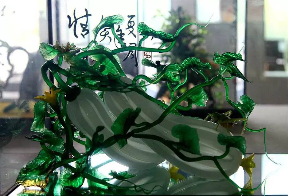 上二楼,首先被迎面而来的琉璃挂件陶醉。看吧,硕大的毛笔与精致的竹签就那么挂在那里,让我们立刻有一种穿越时空的感觉。拐弯,不仅被二楼更大的展品空间震撼,尤其被五彩缤纷的各种挂件、屏风折服。鸡油黄、鸡肝石、鸡血红、宝石蓝、松石绿等各种颜色的琉璃品兀然静立,象牙白、豆芽绿、鹅毛黄等各种色彩的挂件依墙而立,展厅中间长条桌上的作品更多,这里有动物、植物类的琉璃作品,有酒盅、茶碗、烟灰缸等日用类的琉璃用品,琳琅满目的摆件令人应接不暇。走到展桌尽头,一排精致的琉璃球特别引人注目。原来,这就是我们的董事长李先生的创意——这别出心裁的制作,让12个精美的琉璃球记录了胎儿的整个成长过程。至于牡丹、石榴、西瓜、白菜、青松等琉璃作品,我们已经不能用一个“震撼”的词汇来形容了。
