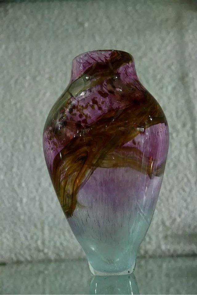 走进“西冶工坊”,不进琉璃展厅算是白来了。这是紧挨热成型车间东头的二层楼房。进一楼,我们会有恍如走进流光溢彩童话世界的感觉。展室的四面墙上处处展示着色彩不一、形状各异、大小不同的瓶子、人物、动物、鸟类工艺品。产品既有典雅、庄重的古风遗韵,又有异域的、当代的清新气息。这里有似是而非的抽象雕塑,有惟妙惟肖的人物造型,有巧夺天工的金属摆件,有风格迥异的花器花盆……这些琉璃作品在灯光的映衬下流光溢彩,散发着诱人的光彩。在李先生讲解下,我们知道摆在这里的每一件琉璃作品都是孤品,由于纯手工因素,即使同一人制作同一种作品也绝不会出现雷同。在这里,少到几千元,多到几万甚至十多万元的琉璃珍品比比皆是。