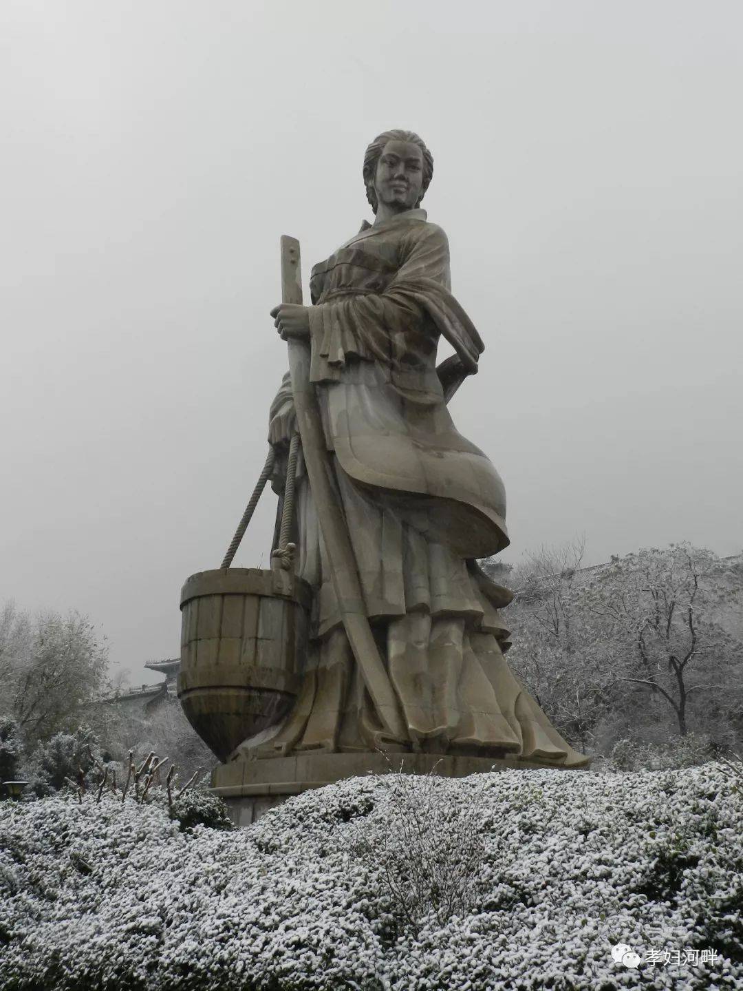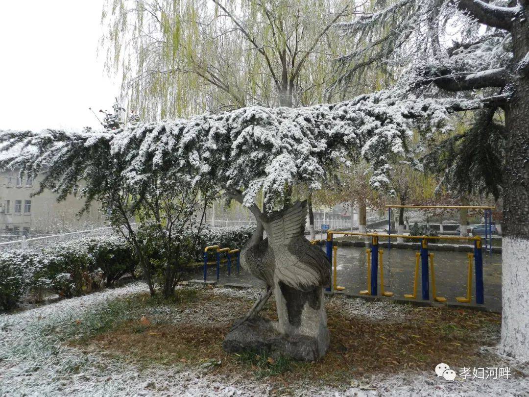 小雪下起来不停,连石雕的仙鹤都躲到树下避雪。