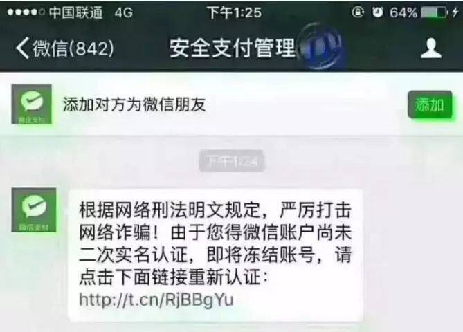 近日,广州市反诈中心接到群众举报,称其微信收到账号名为“安全支付管理”发送的消息,要求点击其中的网络链接进行微信二次实名认证,否则冻结其微信账号。