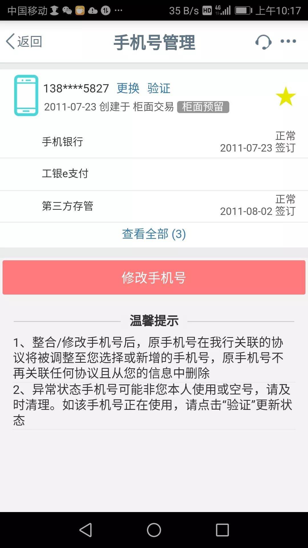 按照中国人民银行管理规定,开通线上结算功能需要验证社保卡银行账号的预留手机号码。如果申领实体卡时已经预留本人实名制手机号码,则可开通电子社保卡结算功能。如未预留,需先去社保卡所属合作银行网点办理“预留手机号码”业务,或通过合作银行手机APP进行修改,然后开通电子社保卡结算功能。(中国工商银行手机APP的预留号码修改位置:安全中心-手机号管理,如下图)