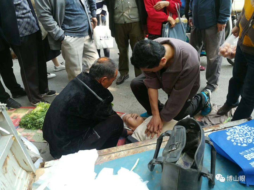5月3日早上,在博山白虎山菜市场有一老太太突然晕倒在地,正巧被买早饭的淄博市第一医院的心内一科副主任李军看到,他毫不犹豫的跪地抢救。